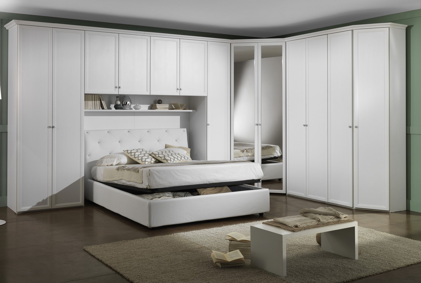 Composizione armadio a ponte in finitura frassino bianco per creare un ambiente dal risultato sobrio e cromaticamente omogeneo. Mensola sottoponte inserita per utilizzare al meglio tutti gli spazi, per riporre e ordinare i propri libri e oggetti. Le cornici con bordo intagliato regalano un effetto tridimensionale e i pomelli in metallo con la particolare lavorazione impreziosiscono il risultato finale. La composizione si completa con una capiente cabina a specchio, l’aggiunta di altri vani e un terminale.
