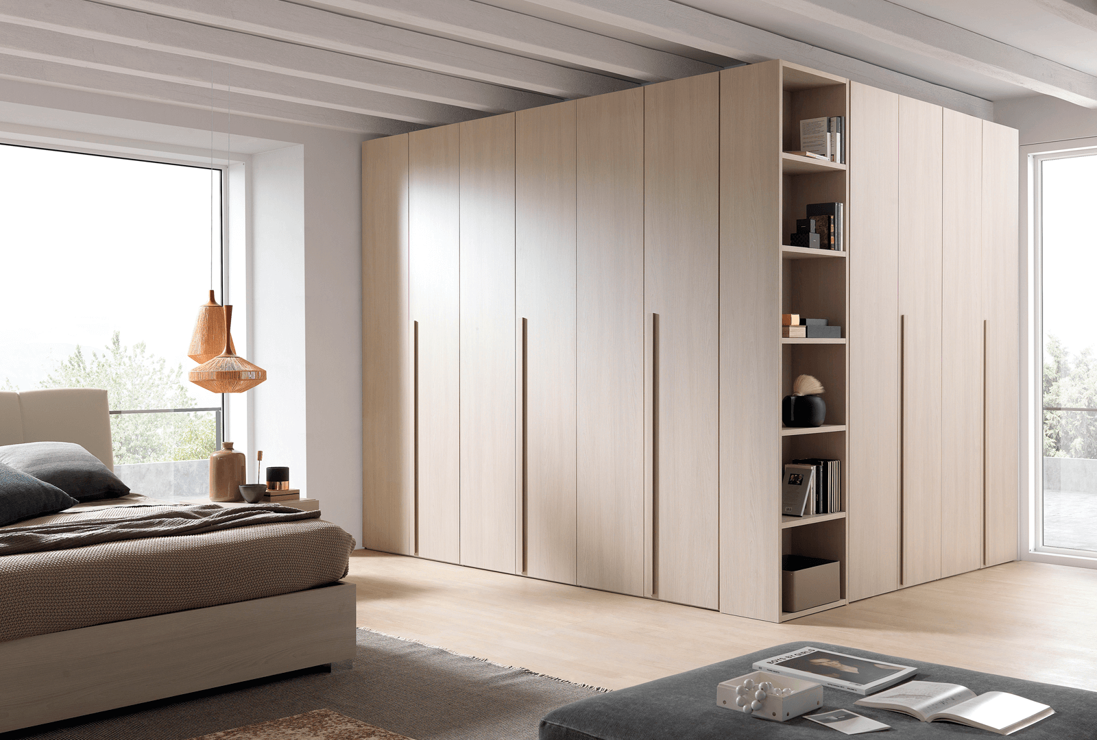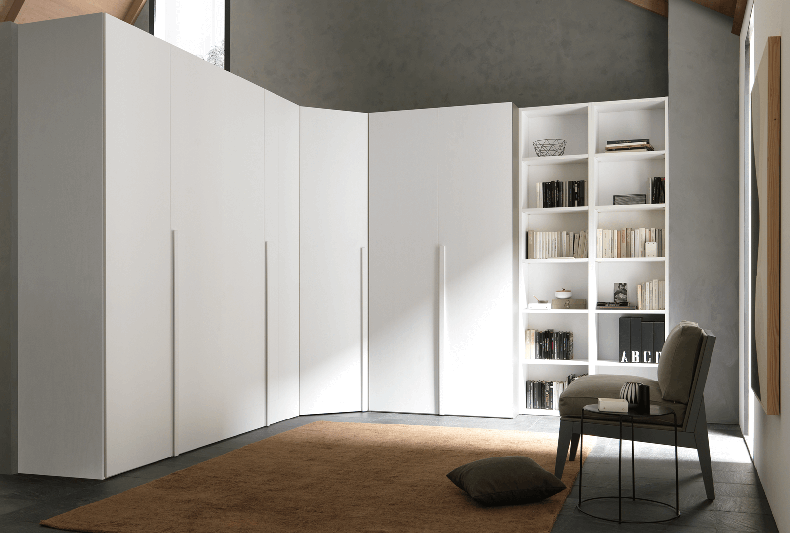 Soluzioni creative che arredano e salvano lo spazio. Posizionare la libreria Flat in testa all’armadio, la cui lunghezza è stata appositamente progettata per coincidere perfettamente con la profondità del fianco armadio, per stupire e sfruttare al meglio ogni centimetro disponibile. Libreria Flat progettata in tutte le finiture legno a cui si aggiunge anche la moderna tonalità dello spatolato.